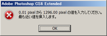 Adobe Photoshop CS6では、最大 1296.00 pixelまでです。10000 pixel等上限を超えた数値を入力すると下記のメッセージが表示されます。